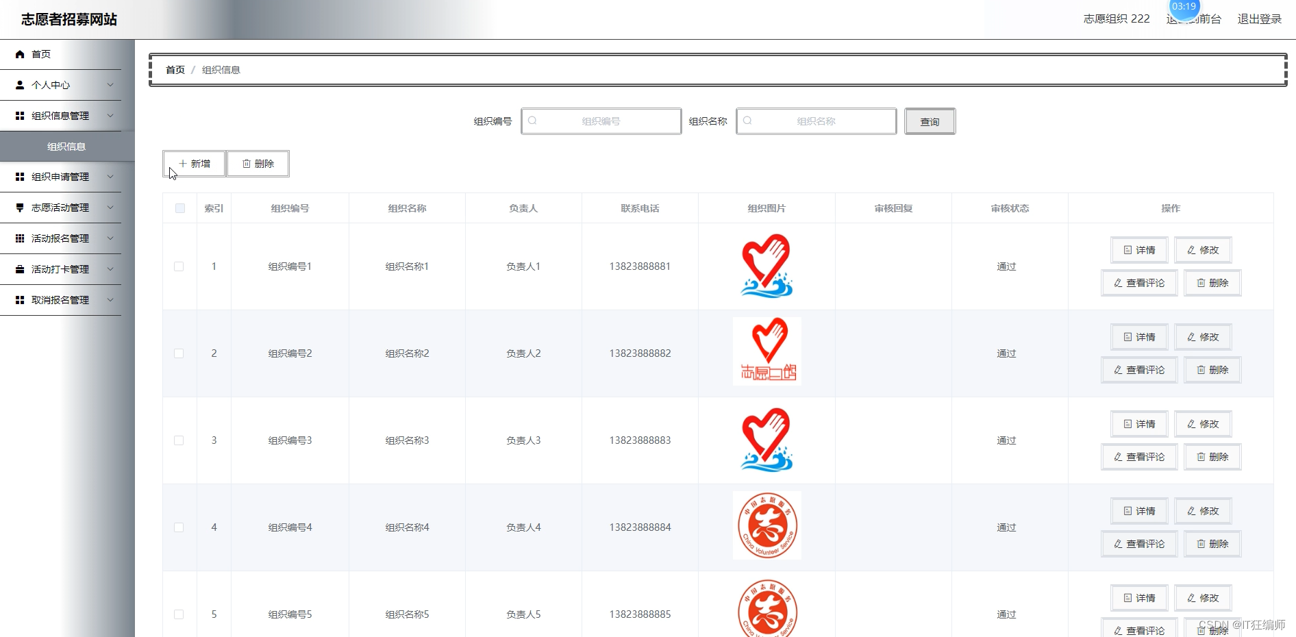 组织信息管理,在组织信息管理页面可以对组织编号,组织名称,负责人,联系电话,组织图片,审核回复,审核状态等内容进行详情,查看评论和删除等操作;