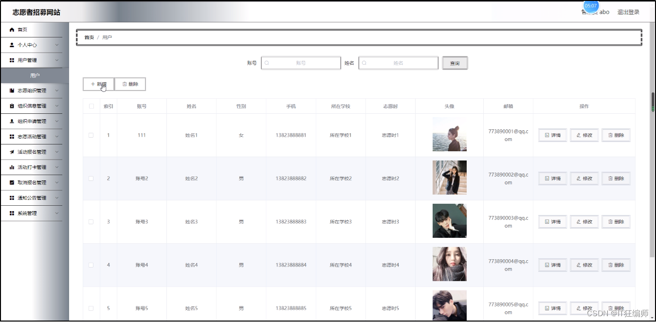 用户管理,在用户管理页面可以对账号,姓名,性别,手机,所在学校,志愿时,头像,邮箱等内容进行详情,修改和删除操作;
