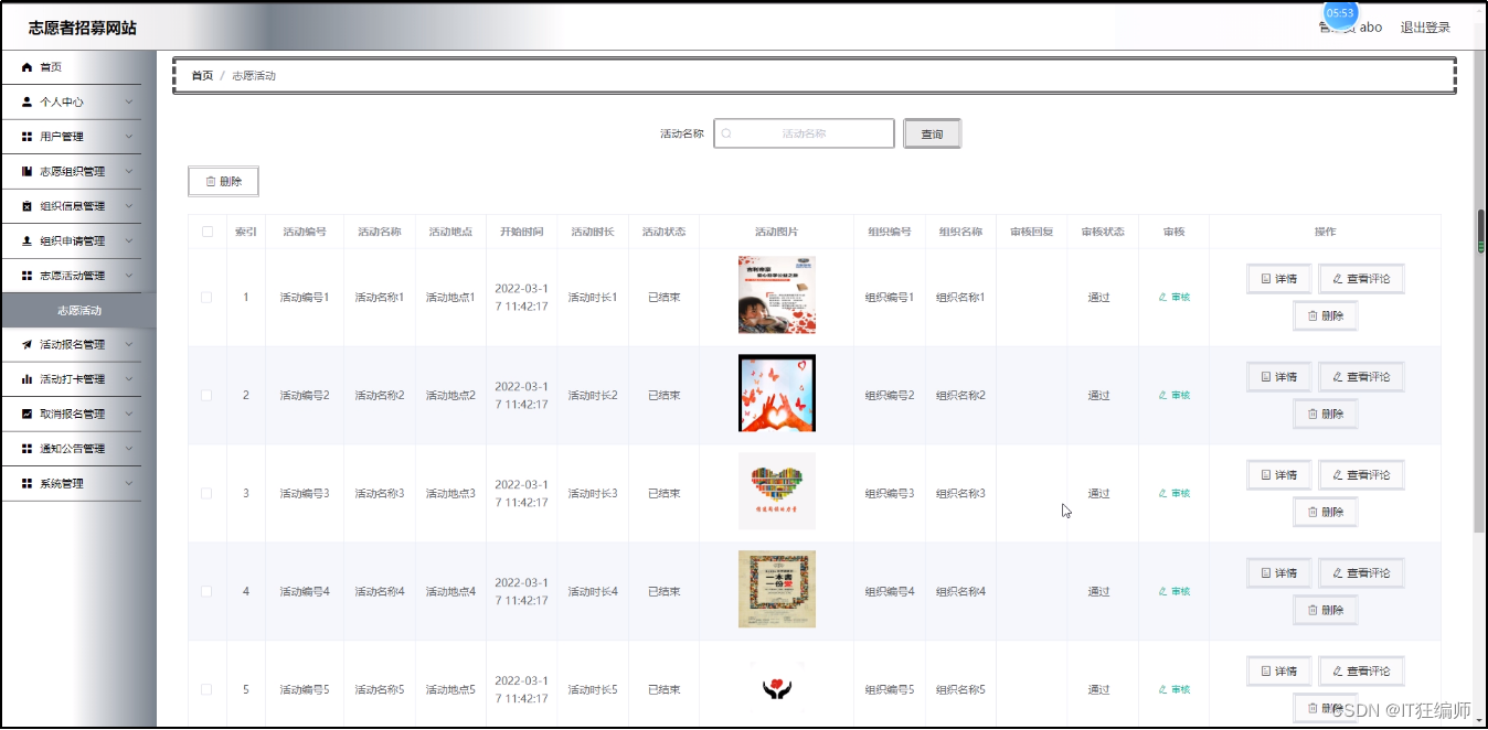 志愿活动管理,在志愿活动管理页面可以对活动编号,活动名称,活动地点,开始时间,活动时长,活动状态,活动图片,组织编号,组织名称,审核回复,审核状态等内容进行详情,查看评论和删除等操作;