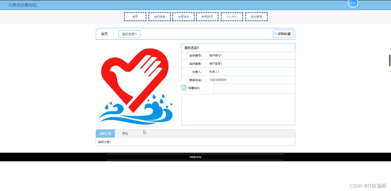 组织信息,在组织信息页面可以查看组织名称,组织编号,组织宣言,负责人,联系电话等内容,并进行评论和收藏操作;