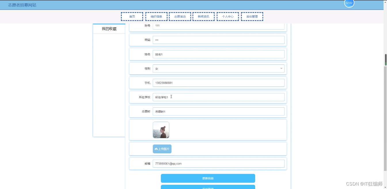 个人中心,在个人中心页面通过填写账号,密码,姓名,性别,上传图片,手机,所在学校,志愿时等内容进行更新信息操作,并根据需要对我的收藏进行详细操作;