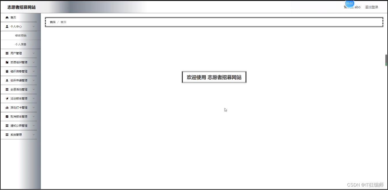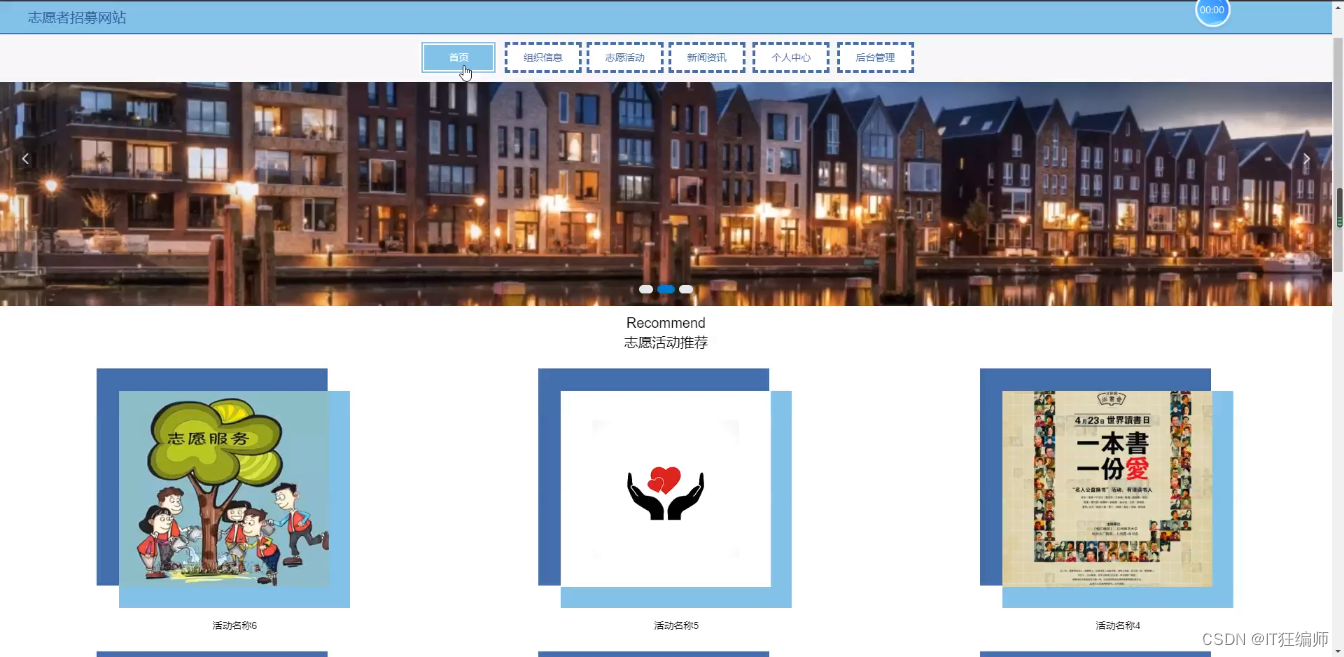 志愿者招募网站,在网站首页可以查看首页,组织信息,志愿活动,新闻资讯,个人中心,后台管理等内容,并进行详细操作;