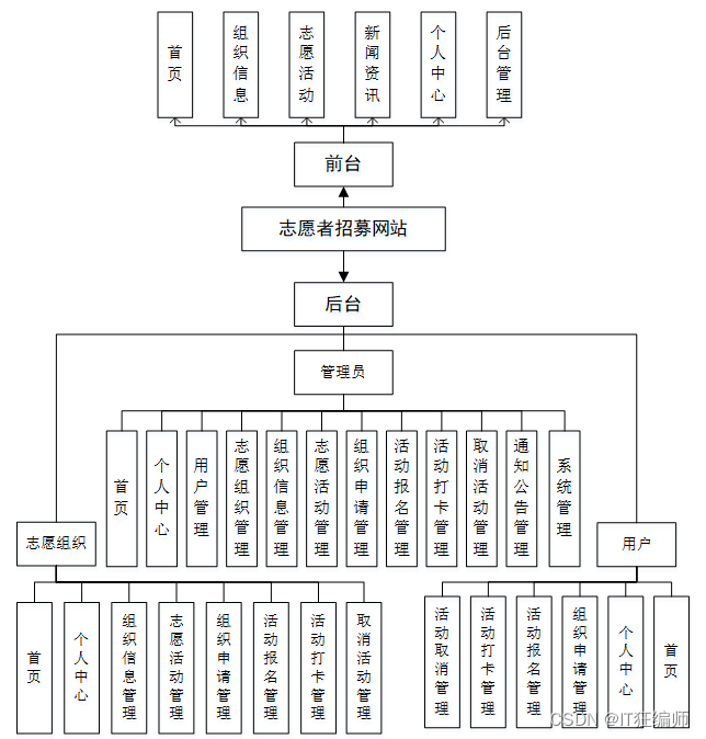 考虑到实际生活中在志愿者招募管理方面的需要以及对该系统认真的分析,将系统权限按管理员,志愿组织和用户这三类涉及用户划分。为了更好的去理清本系统整体思路,对该系统以结构图的形式表达出来,设计实现该志愿者招募网站的功能结构图如下所示: