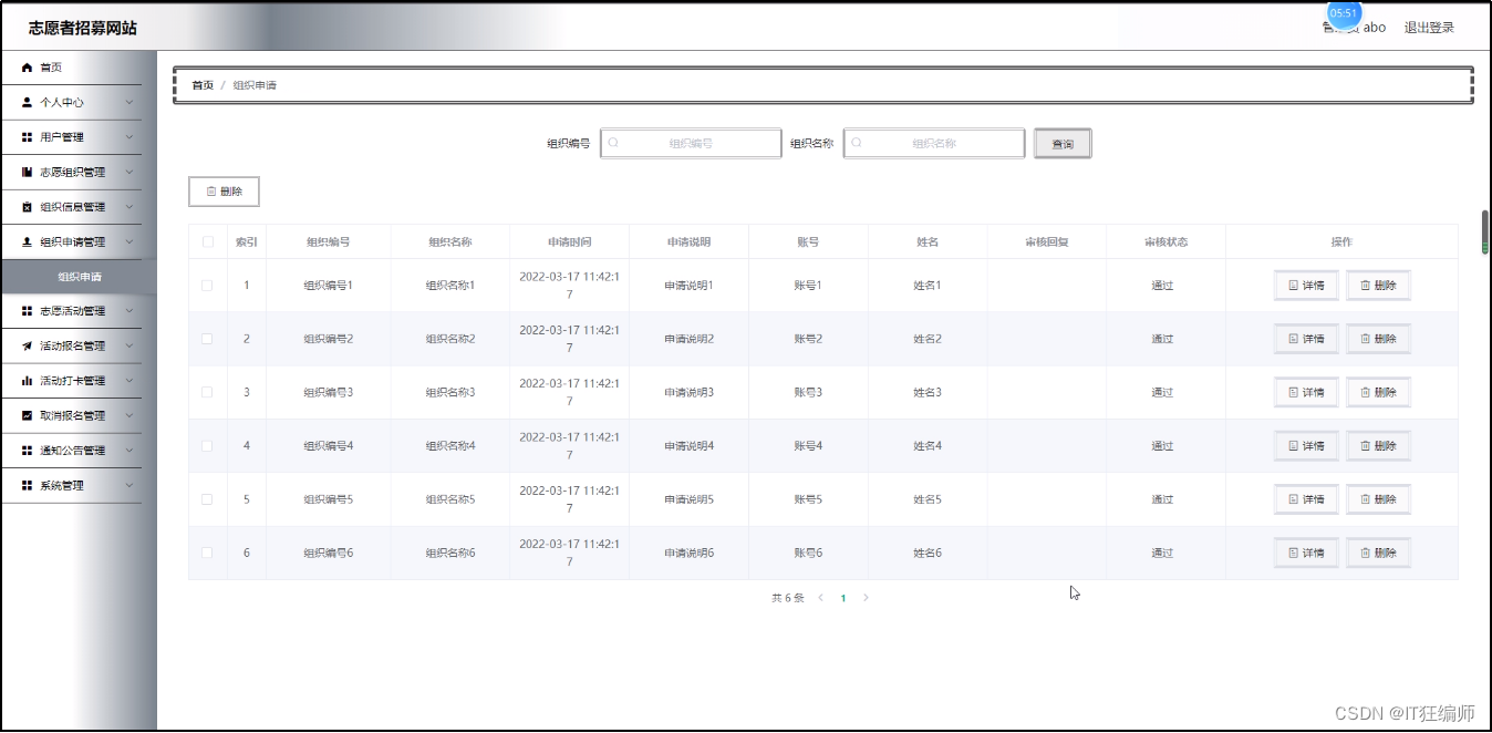 组织申请管理,在组织申请管理页面可以对组织编号,组织名称,申请时间,申请说明,账号,姓名,审核回复,审核状态等内容进行详情和删除等操作;