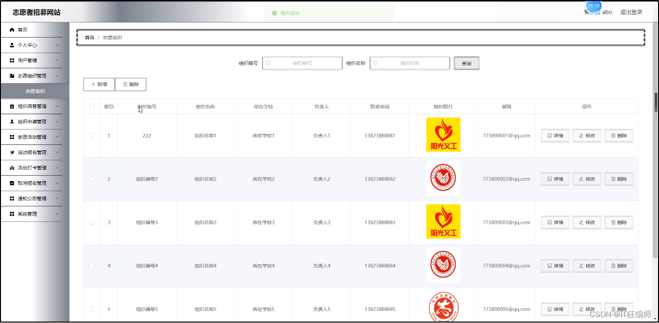 志愿组织管理,在志愿组织管理页面可以对组织编号,组织名称,所在学校,负责人,联系电话,组织图片,邮箱等内容进行详情,修改和删除等操作;