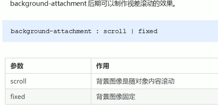 background-attachment 属性设置背景图片是否固定或者随着叶念的其余部分滚动.