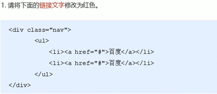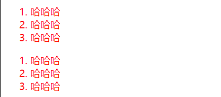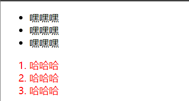 现在有两个列表标签, 我们现在有需求 : 需要将ol中的li的属性改为color: red, 就可以使用后代选择器: