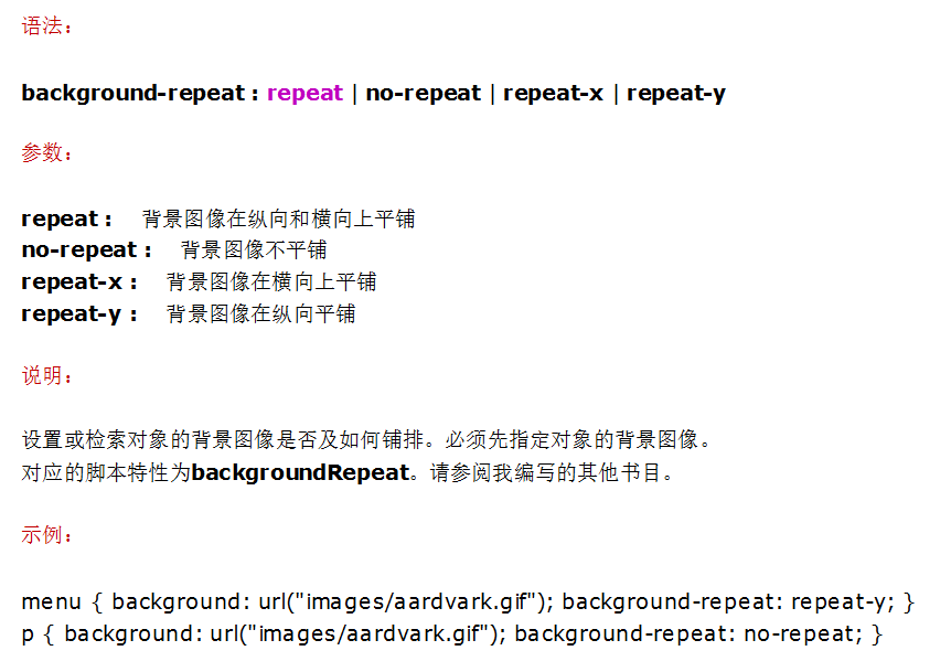 这种重复的情况就是称为背景平铺, 如果需要在HTML页面上对背景进行平铺, 那么就需要使用欧冠background-repeat属性来设置: