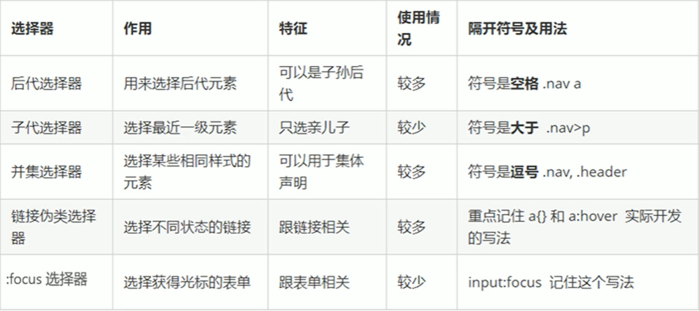 - 常用的复合选择器包括, 后代选择器, 子选择器, 并集选择器, 伪类选择器等等