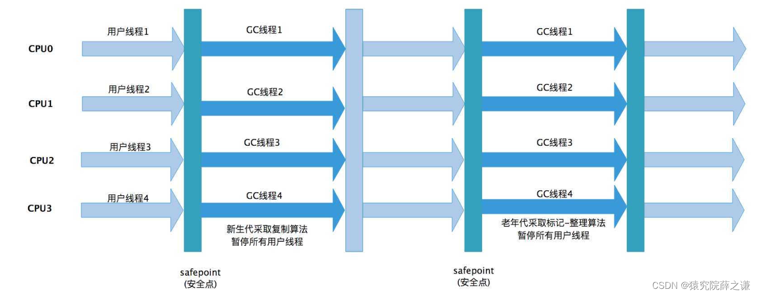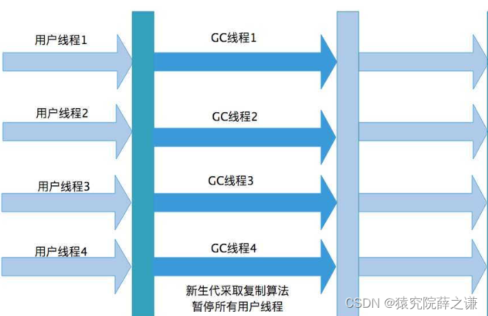 线程:它是一个单线程收集器。它会使用一条垃圾收集线程去完成垃圾收集工作,并且它在进行垃圾收集工作的时候,必须暂停其他所有的工作线程( "Stop The World" ),直到收集结束。