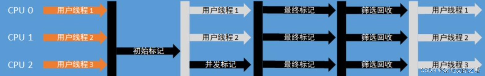GC和用户线程,用一个闭包结构去记录可达对象。但在这个阶段结束,这个闭包结构并不能保证包含当前所有的可达对象。因为用户线程可能会不断的更新引用域,所以 GC 线程无法保证可达性分析的实时性。所以这个算法里会跟踪记录这些发生引用更新的地方。 - 重新标记: 重新标记阶段,是为了修正并发标记期间因为用户程序继续运行而导致标记产生变动的那一部分对象的标记记录,这个阶段的停顿时间一般会比初始标记阶段的时间长,远远比并发标记阶段时间短