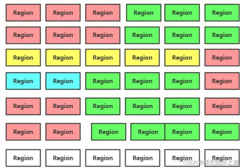 不同于Serial系列、Parallel系列、CMS系列,它们都是基于把内存进行物理分区的形式把JVM内存分成老年代、新生代、永久代或MetaSpace,这种分区模式下进行垃圾收集时必须对某个区域进行整体性的收集(比如整个新生代、整个老年代收集或者整个堆)。然后以Region为单位自由的组合成新生代、老年代、Eden区、survior区、大对象区(Humonggous Region)