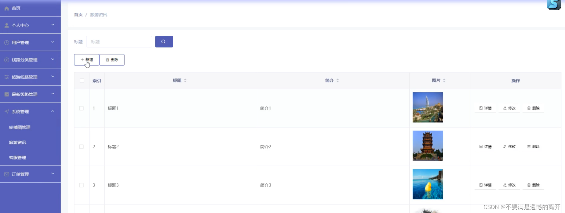 旅游资讯:管理员通过列表可以进行查看标题、简介、图片等信息,进行详情、修改或删除操作,并通过新增进行添加旅游资讯信息或删除操作 。