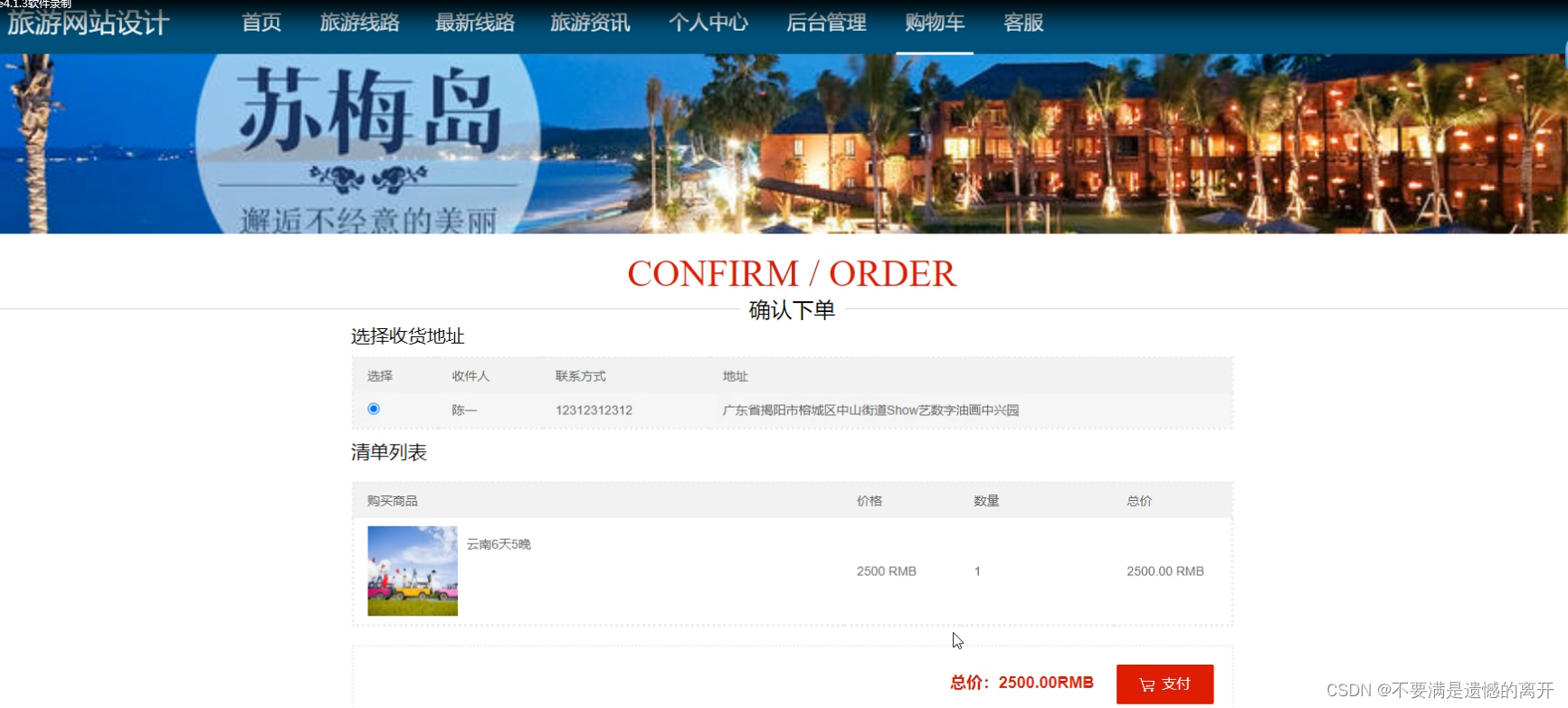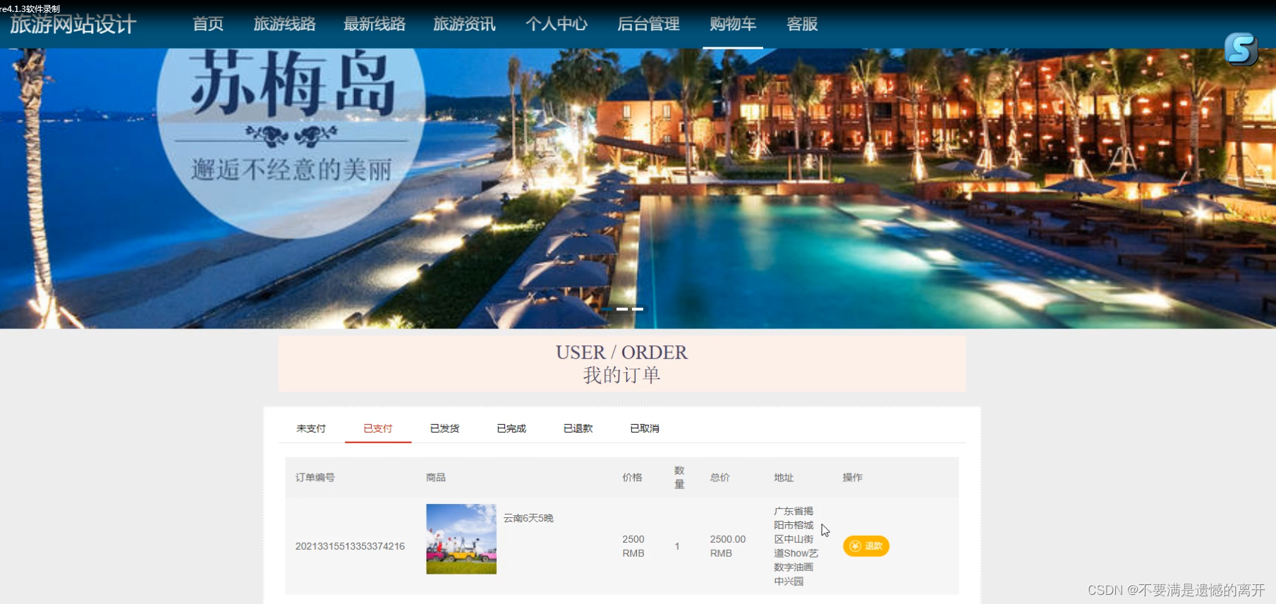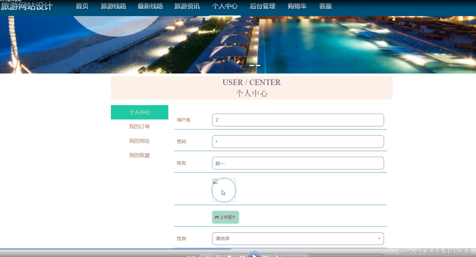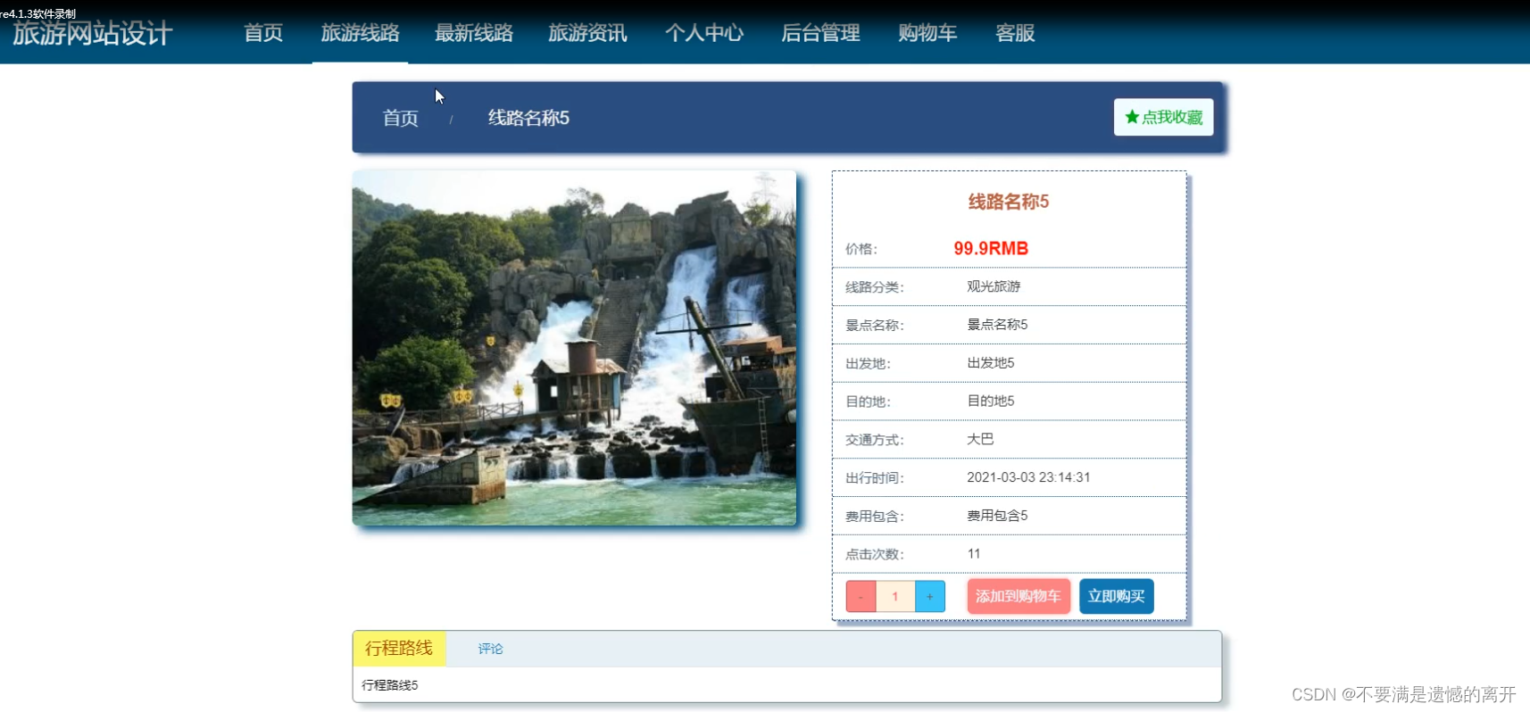 用户登录成功后,可以进行查看旅游路线、最新线路、旅游资讯、个人中心、后台管理、购物车、客服等功能模块。进行相对应操作。