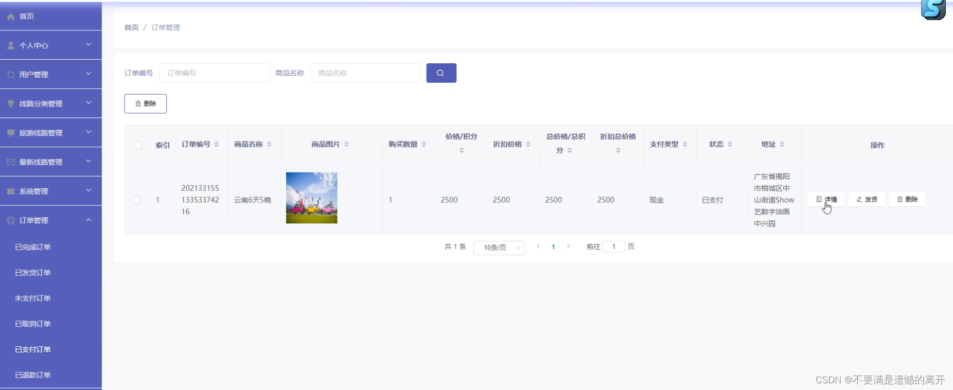 用户登录成功后,可以进行查看个人中心、用户管理、路线分类管理、旅游路线管理、最新路线管理、系统管理、订单管理等功能模块。进行相对应操作。