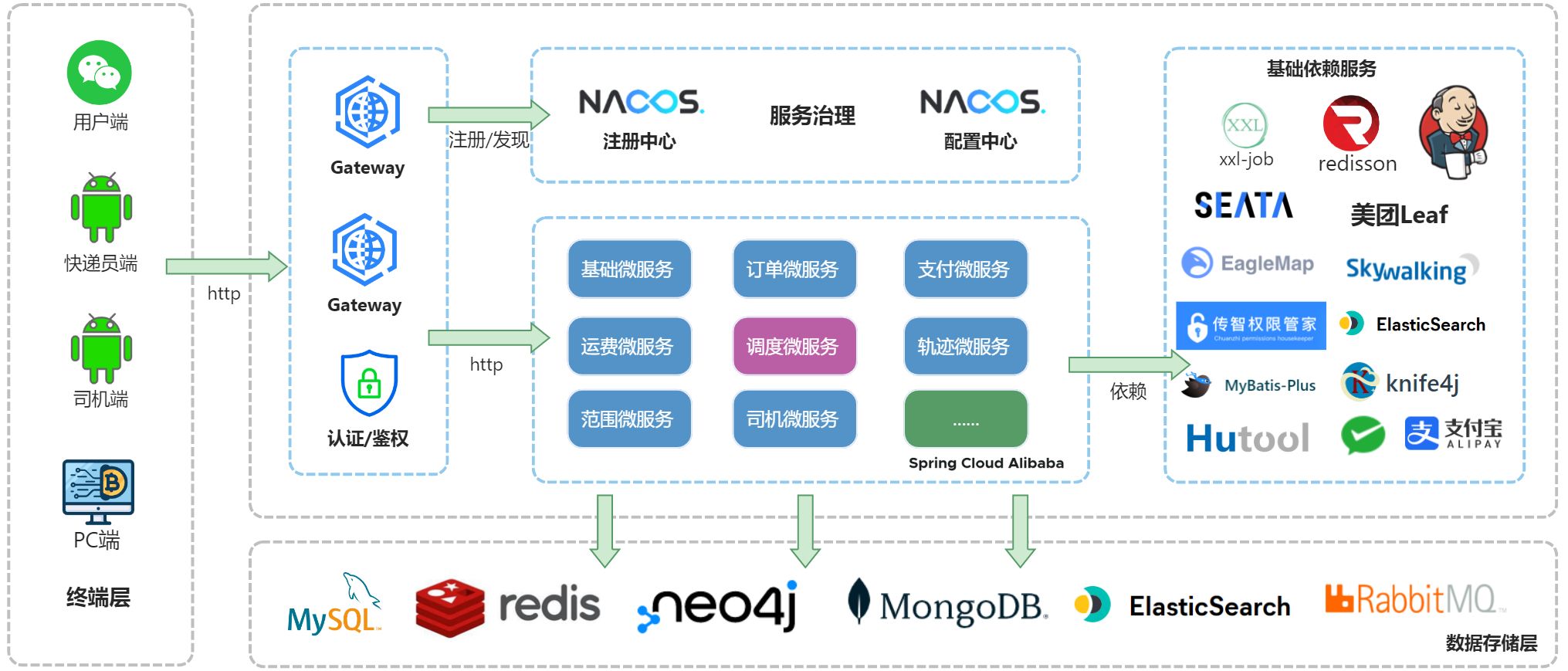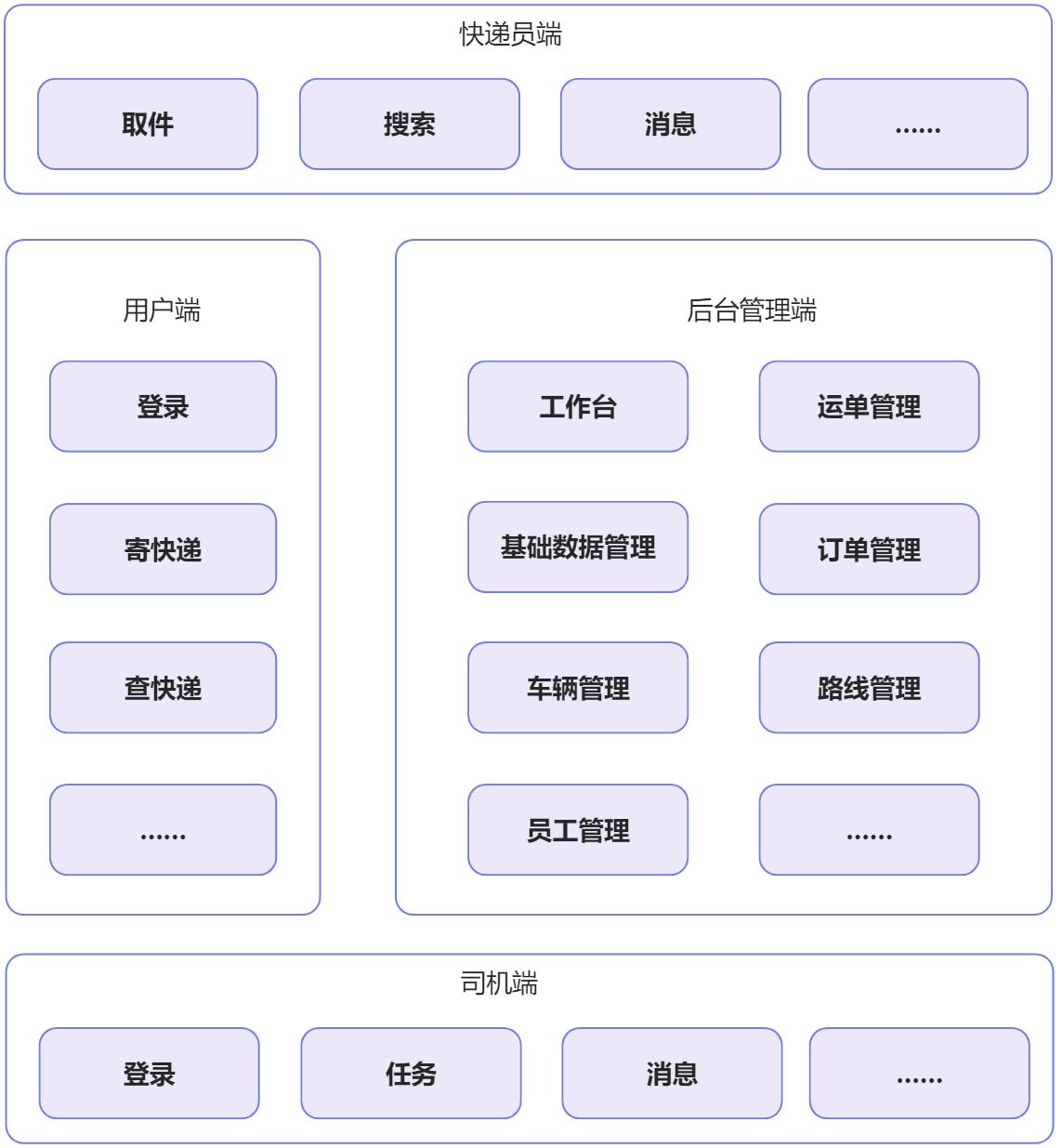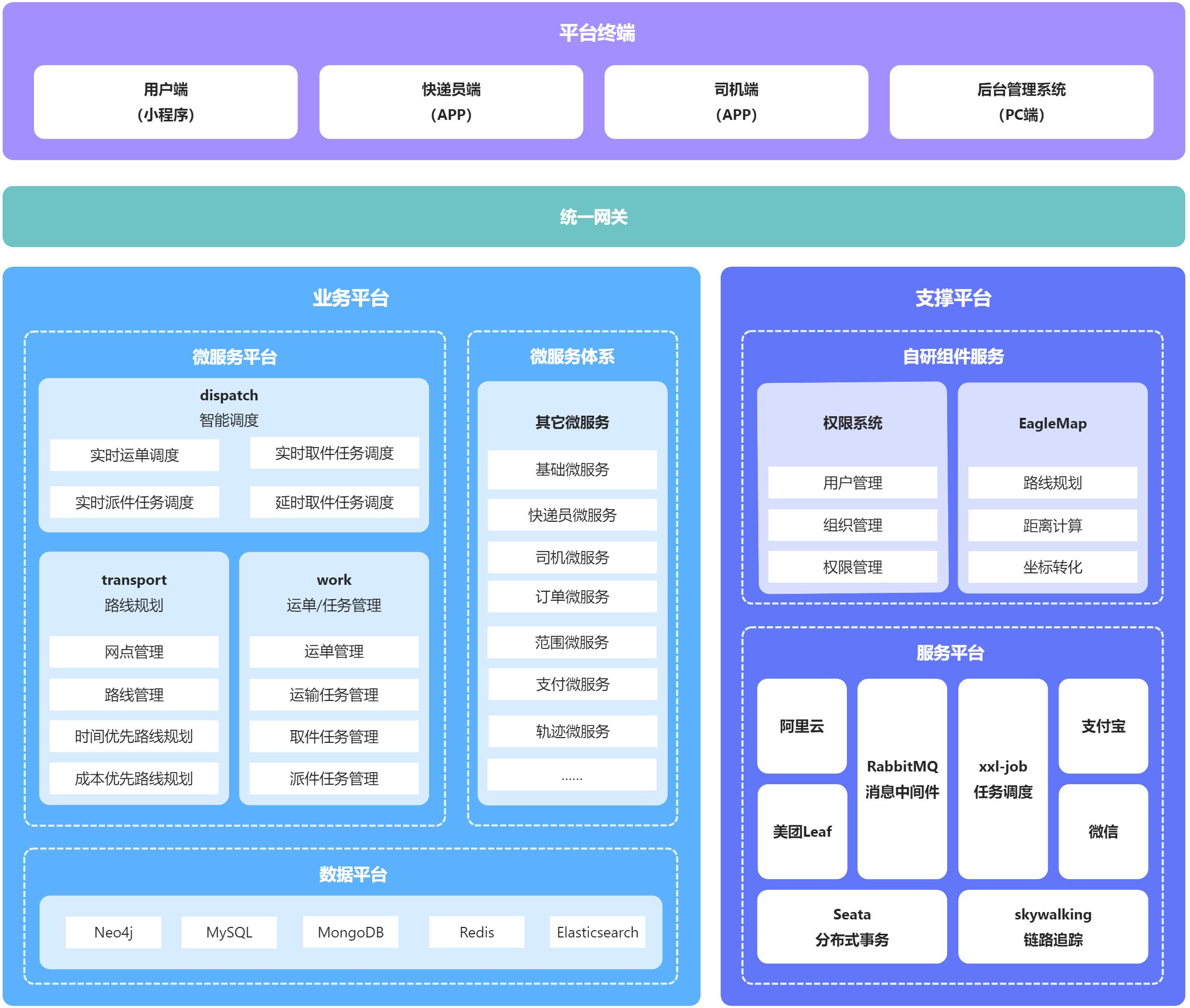 - 用户端:基于微信小程序开发,外部客户使用,可以寄件、查询物流信息等。