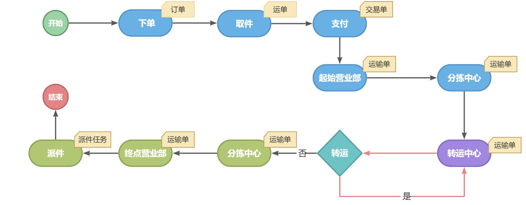 - 快件开始运输,会经历起始营业部、分拣中心、转运中心、分拣中心、终点营业部之间的转运运输,在此期间会有多个**【运输任务】**