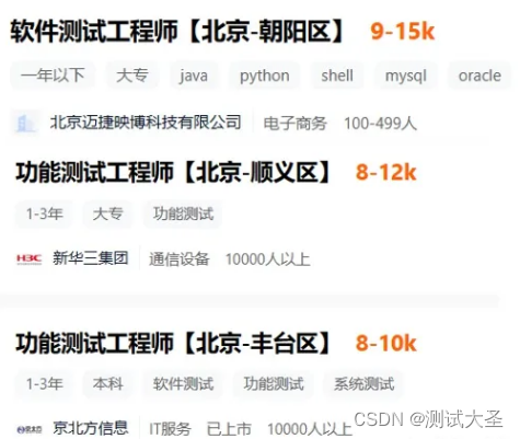 由于大多数小白转行到测试行业,做的都是功能测试的活,所以起薪不会很高。我们打开招聘网站,搜索北京的软件测试工程师(1-3年),看看薪酬情况: