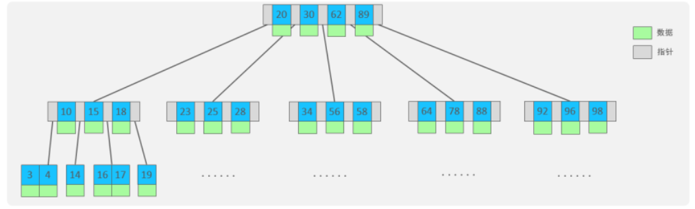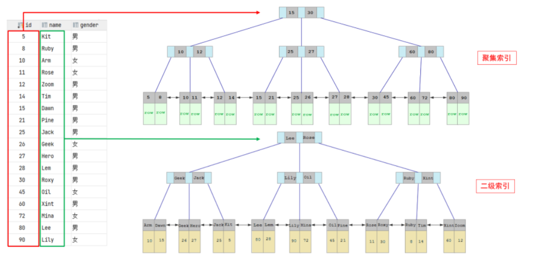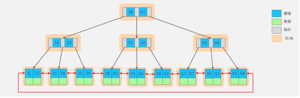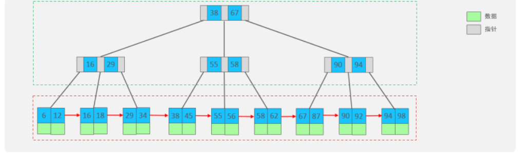 绿色框框起来的部分,是索引部分,仅仅起到索引数据的作用,不存储数据。红色框框起来的部分,是数据存储部分,在其叶子节点中要存储具体的数据。