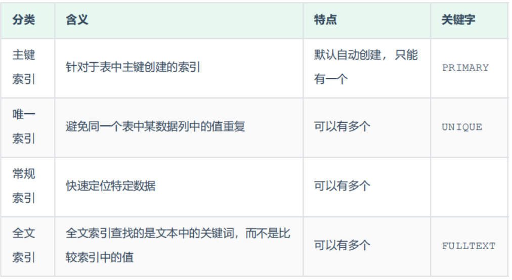 在MySQL数据库,将索引的具体类型主要分为以下几类:主键索引、唯一索引、常规索引、全文索引。