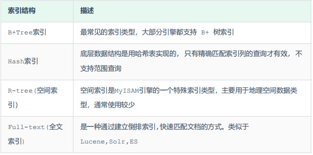 上述是MySQL中所支持的所有的索引结构,接下来,我们再来看看不同的存储引擎对于索引结构