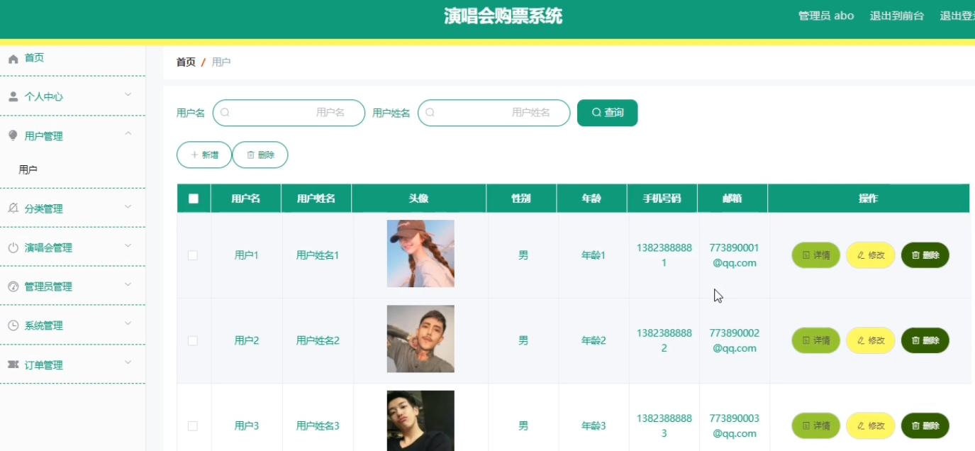 系统管理员可以对用户信息进行添加,修改,删除操作。界面如下图所示: