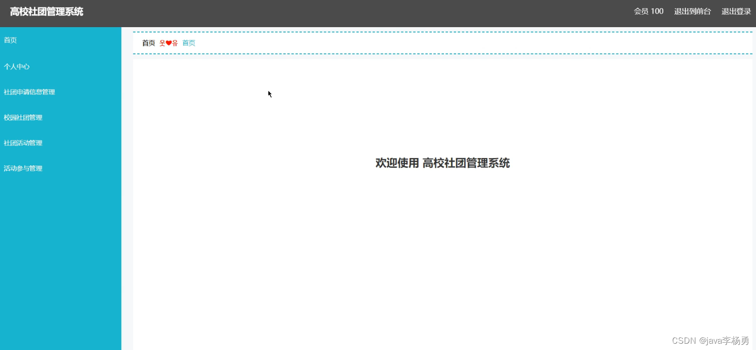 管理员在高校社团管理系统页面可以查看首页、个人中心、学生管理、社团申请信息管理、校园社团管理、社团活动管理、会员管理、活动参与管理、会员申请管理、系统管理等。程序成效图如下图5-2所示: