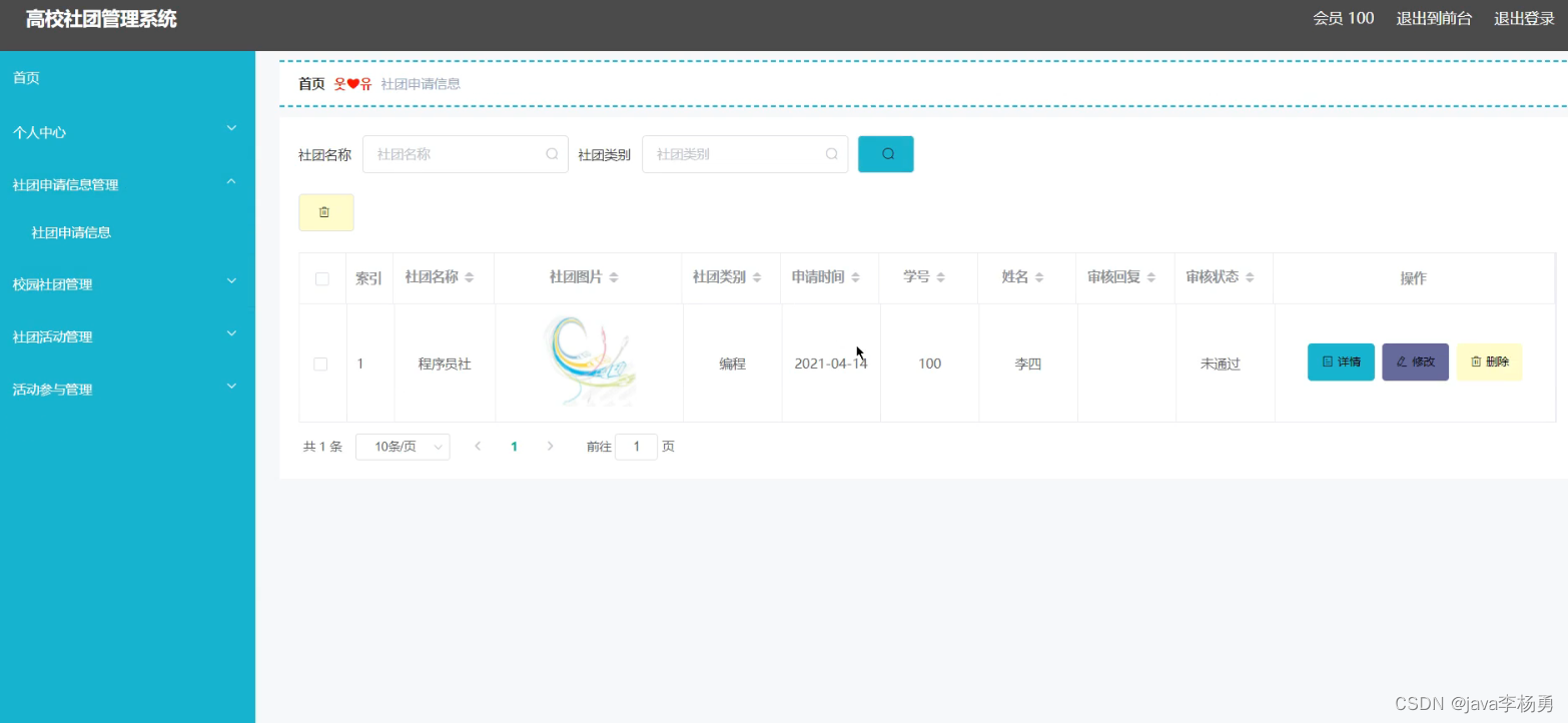 本文以Java为开发技术,实现了一个高校社团管理系统。高校社团管理系统的主要实现功能包括:管理员:首页、个人中心、学生管理、社团申请信息管理、校园社团管理、社团活动管理、会员管理、活动参与管理、会员申请管理、系统管理,会员;首页、个人中心、社团申请信息管理、校园社团管理、社团活动管理、活动参与管理,学生;首页、个人中心、校园社团管理、社团活动管理、会员申请管理,前台首页;首页、社团申请信息、校园社团、社团活动、活动参与、会员申请、校园资讯、个人中心、后台管理、在线资讯功能,基本上实现了整个高校社团管理系统的过程。