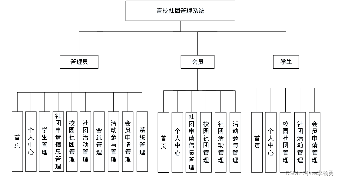 系统架构图属于系统设计阶段,系统架构图只是这个阶段一个产物,系统的总体架构决定了整个系统的模式,是系统的基础。高校社团管理系统的整体结构设计如图4-2所示。