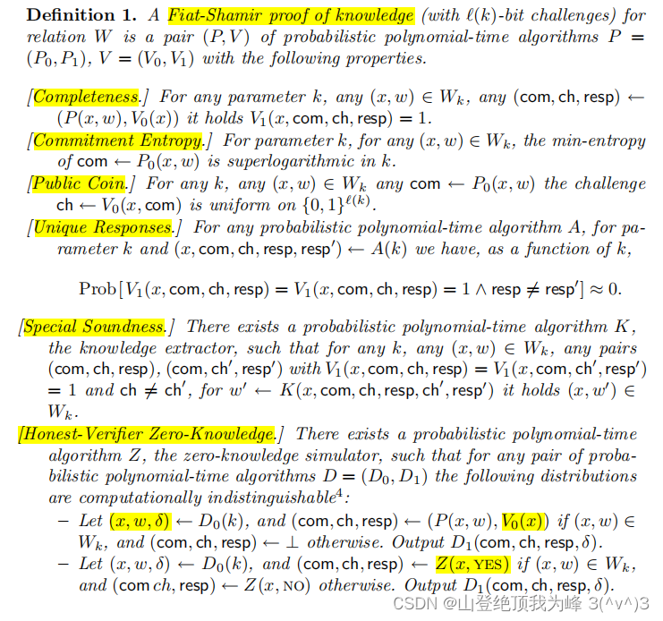 对于关系 W = { W k } k W=\{W_k\}_k W={Wk}k,我们要求它独立于 RO,避免 “self-referencing” 问题,从而使用 Hash 函数实例化之后依然保持启发式的安全。[Fis05] 使用一个带有好多附加性质的 ZKP,使得后续的转换是安全的。 Fiat-Shamir PoK 定义如下: