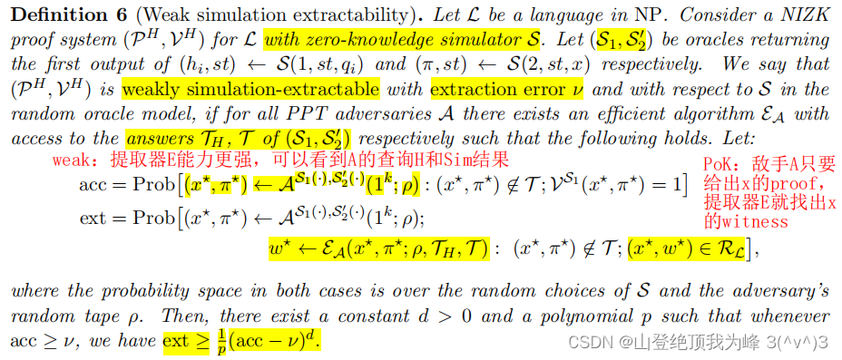 可以证明:给定非凡语言 L L L 的一个 three-round public-coin HVZK IPS ( P , V , S ) (P,V,S) (P,V,S),它满足 quasi unique responses 性质,那么在 RO 模型下由 FS 转换获得的 ( P H , V H ) (P^H,V^H) (PH,VH) 是一个关联到 S S S 的 weak simulation-extractable NIZK,它的 extraction error 为 v = Q / h v=Q/h v=Q/h,其中 Q Q Q 是 RO 查询的次数, h h h 是值域 H H H 的大小。