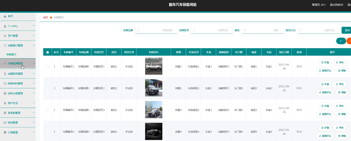 系统管理员可以查看对车辆展示信息进行添加,修改,删除以及查询操作。具体界面如图5.2所示。