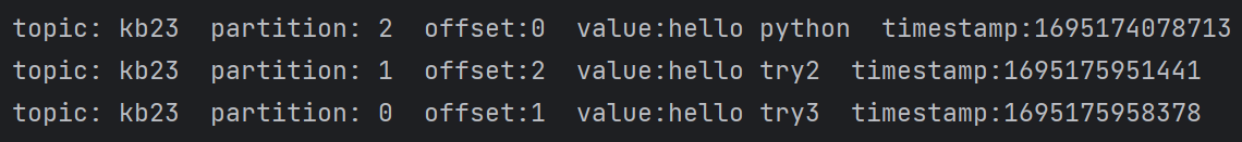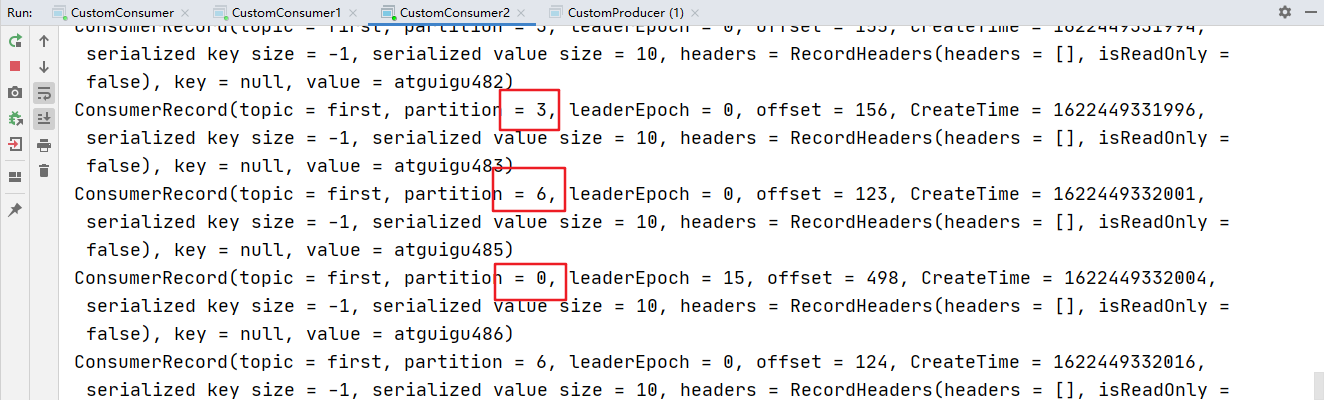 注意:3个消费者都应该注释掉,之后重启3个消费者,如果出现报错,全部停止等会再重启,或者修改为全新的消费者组 // 修改分区分配策略 ArrayList<String> strings = new ArrayList<>(); strings.add("org.apache.kafka.clients.consumer.RoundRobinAssignor"); strings.add("org.apache.kafka.clients.consumer.StickyAssignor"); properties.put(ConsumerConfig.PARTITION_ASSIGNMENT_STRATEGY_CONFIG, strings);