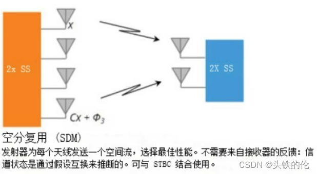 MU-MIMO是基于多天线技术的,这个技术的物理层是多天线技术。多天线可以实现多种技术,不仅仅是MU-MIMO,还包含CSD、STBC、TxBF(波束成型)、SDM(空分复用).