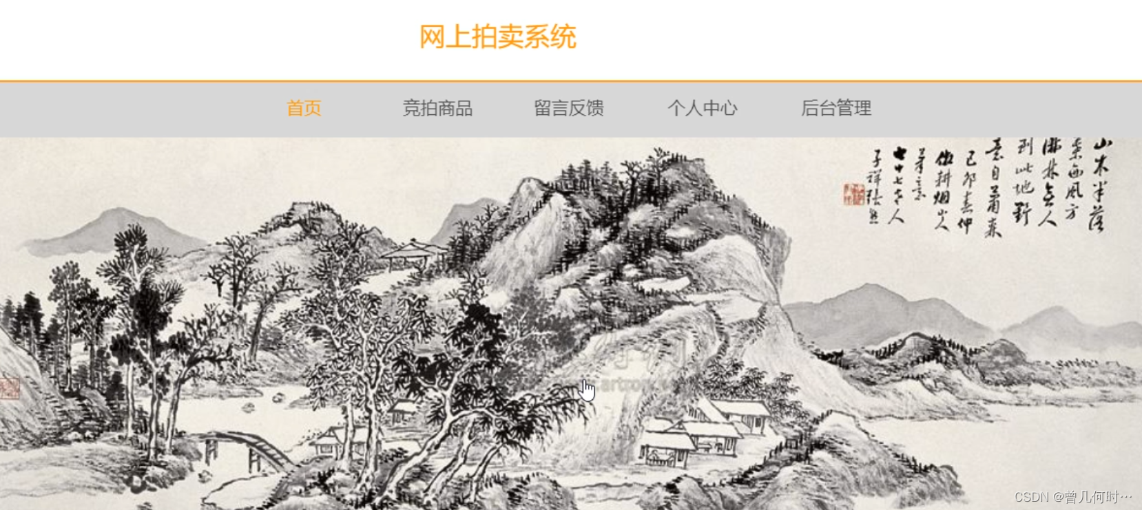 用户进入网上拍卖系统平台可以查看首页、竞拍商品、留言反馈、个人中心、后台管理等操作