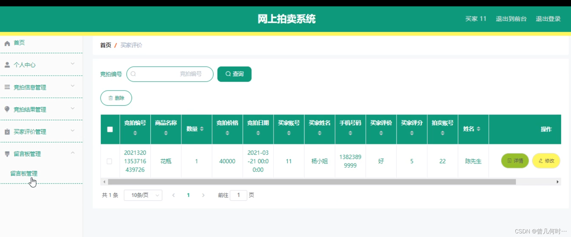 竞拍信息管理:通过列表可以在线获取竞拍编号、商品名称、拍卖账号、姓名、数量、起拍价、竞拍价格、竞拍日期、买家账号、买家姓名、手机号码等信息,进行在线查看、评价、修改或删除操作。