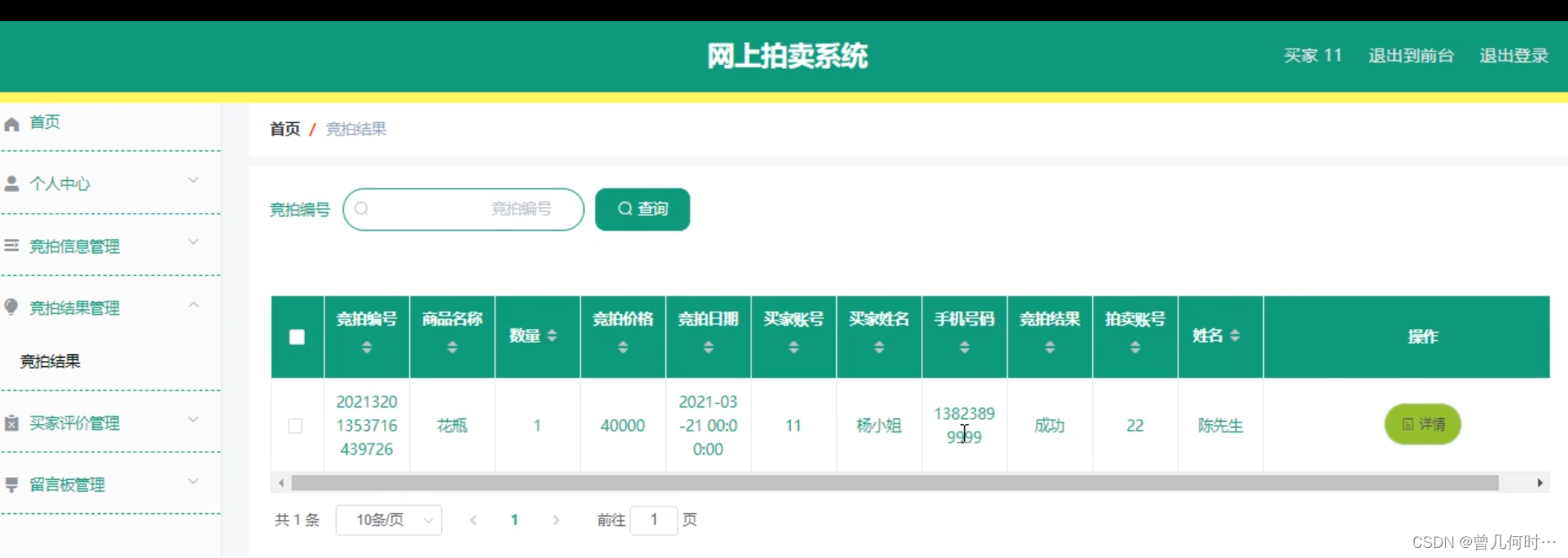 竞拍结果管理:通过列表可以在线获取竞拍编号、商品名称、数量、竞拍价格、竞拍日期、买家账号、买家姓名、手机号码、竞拍结果、拍卖账号、姓名等信息,进行在线查看、详情或删除操作