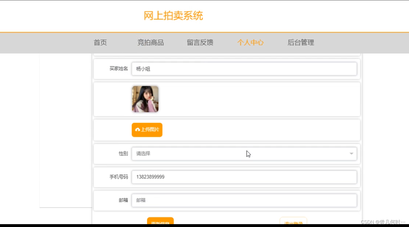 个人信息:通过列表可以在线输入拍卖账号、姓名、头像、性别、邮箱等信息,进行在线修改更新操作