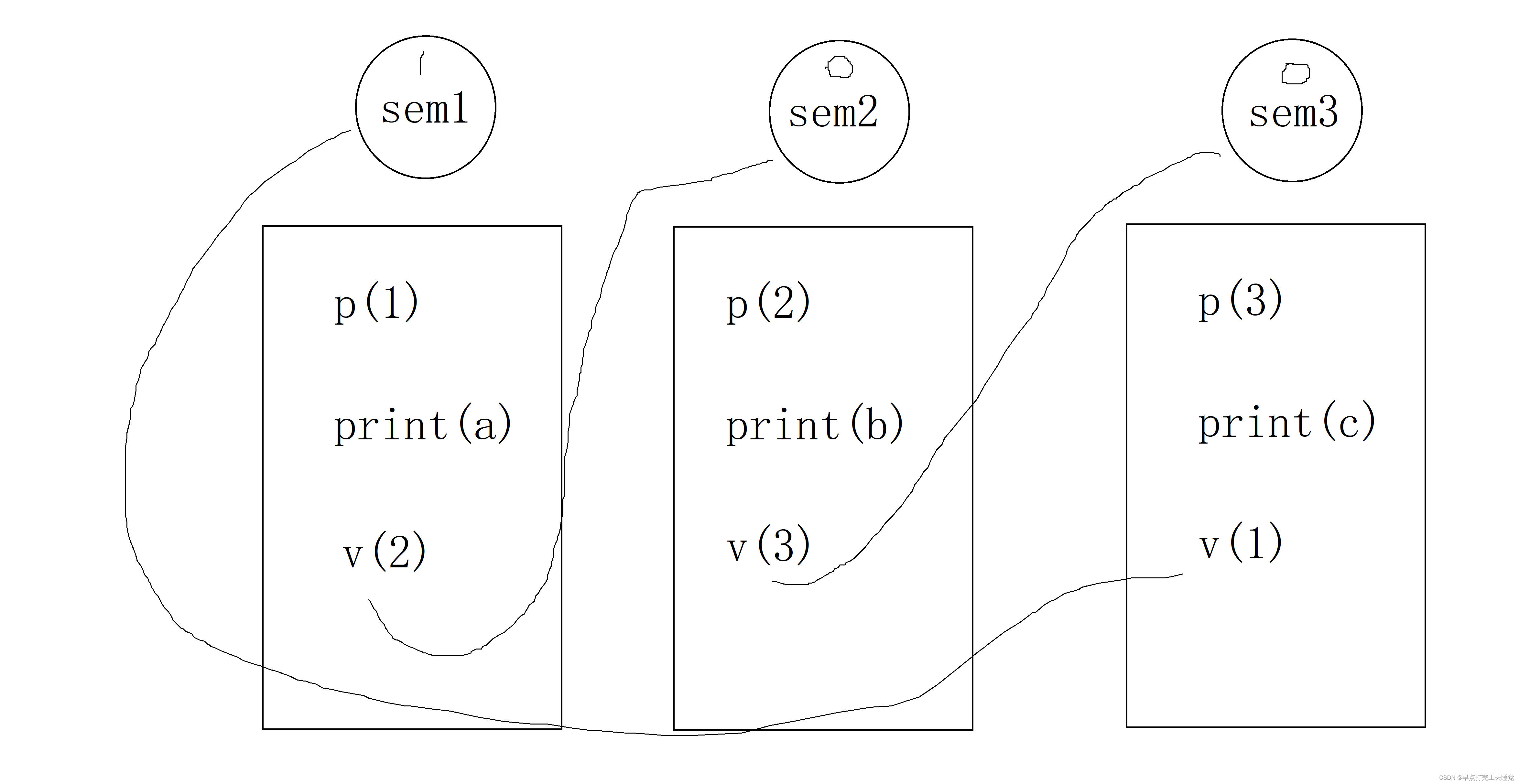 定义三个信号量用于控制字符的打印,设置其初始值为1,0,0,因为刚开始要打印a,那么该信号量应该为1,这样就能让a的线程去p操作,进而让其余线程等待v操作的出现。有点类似于单循环链表的感觉。
