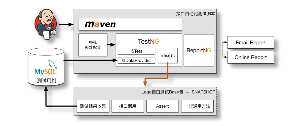 Lego接口自动化测试脚本部分,使用很常见的Jenkins+TestNG的结构。