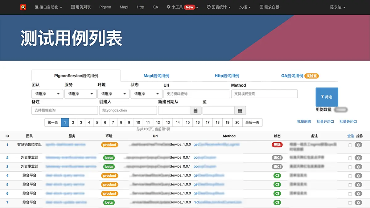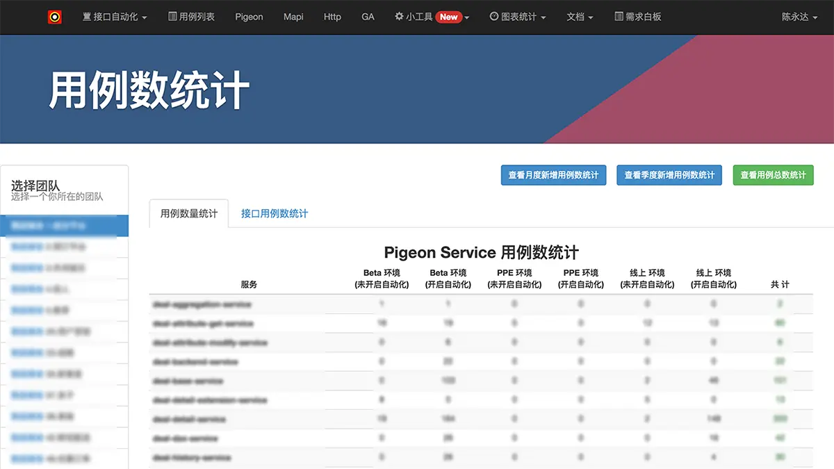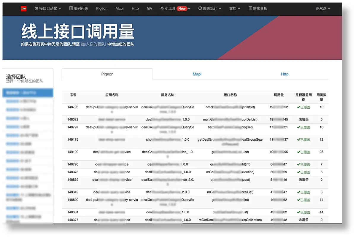 通过线上接口调用量排序的图表。我们可以有效的知道优先维护哪些服务的测试用例,通过表格中,我们可以看到,哪些服务已经覆盖了测试用例,哪些没有被覆盖, 给各组的QA制定用例开发计划,提供参考。