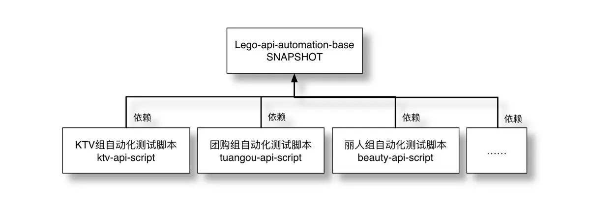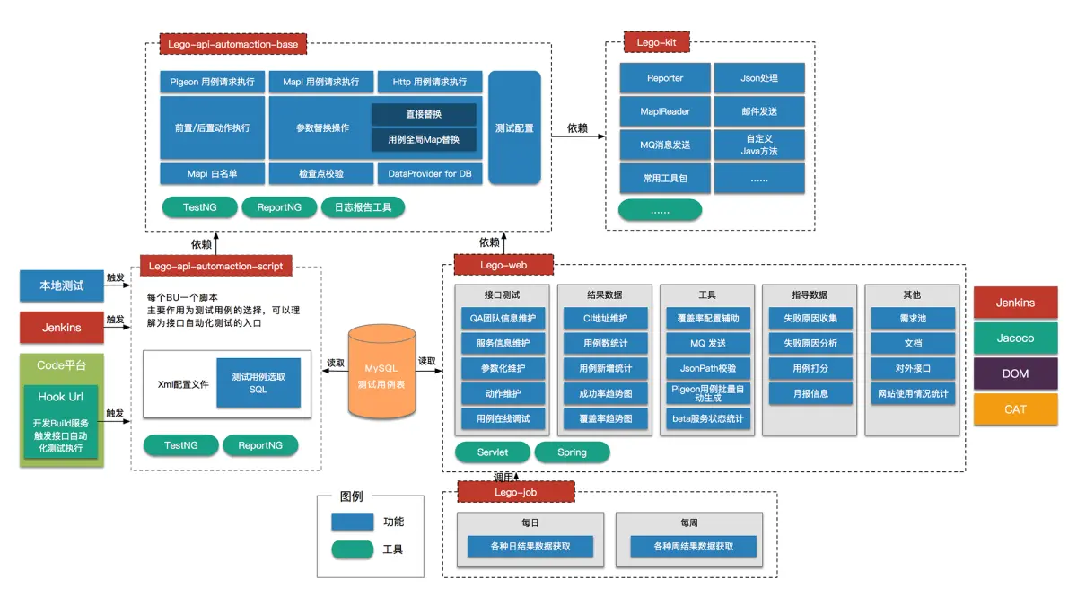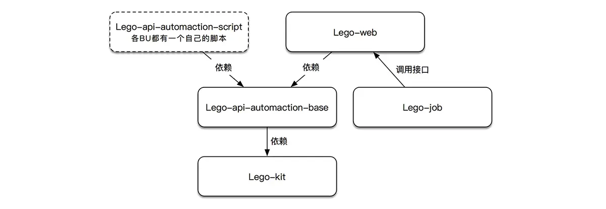 目前Lego由五个不同的项目组成,分别是“测试脚本”、“Lego-web页面项目”、“用于执行接口测试的base包”、“小工具集合Lego-kit”和“lego-job”,通过上图可以看出各项目间的依赖关系。