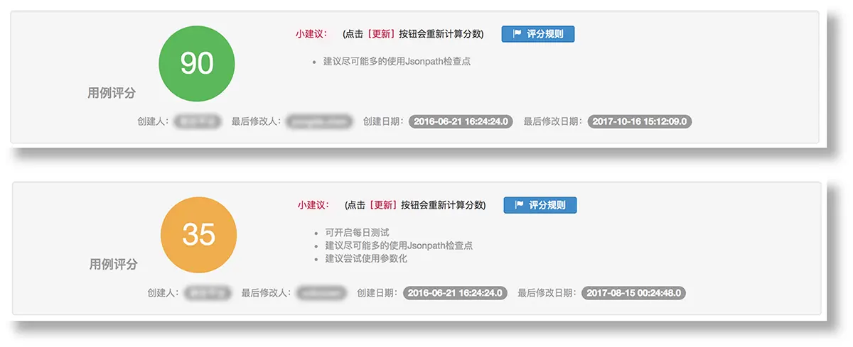 同时在维护接口自动化测试的时候,都会看到用例评分的情况,来协助QA提高用例编写的质量。