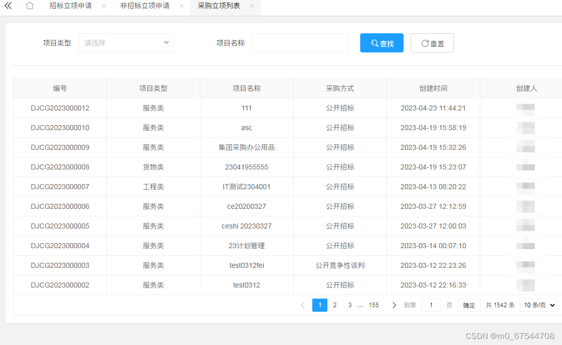3、采购项目管理:可对项目采购过程全流程管理,包含功能有:评审人员的选取/抽取、基准价维护、供应商缴费审核、投标过程记录查询、供应商报价维护、项目评审查询、线下项目管理、采购计划制定与维护。