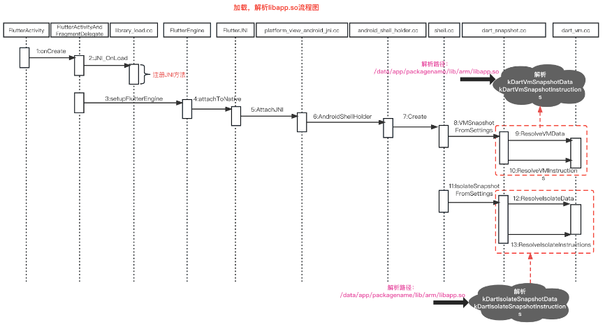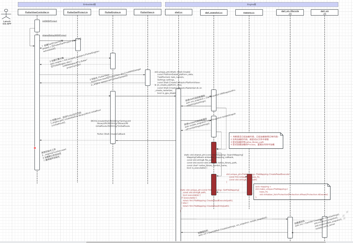 按照4.1的分析思路,我们首先需要了解Flutter运行时代码加载的完整流程,经过梳理分析流程如下:
