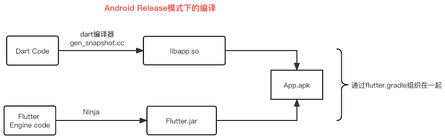 **有完成构建流程可以分析,基本流程是“Dart Code(业务代码)” -> (通过Dart编译器gen_snapshot.cc) 生成 snapshot_assemble.S 的汇编文件 -> (通过xcrun工具)生成 snapshot_assemble.o的obj文件 -> (通过xcun clang工具链) 生成了 App.Framework。