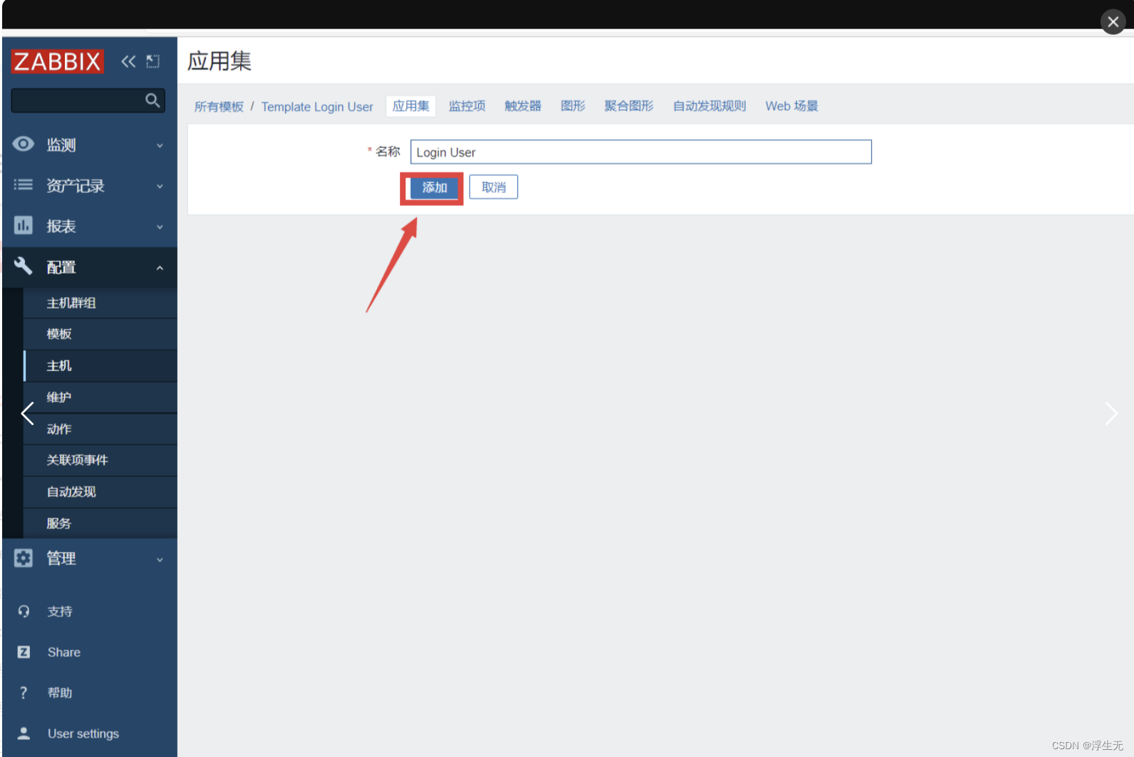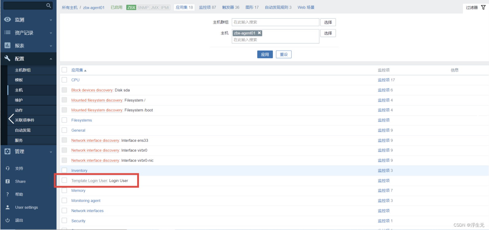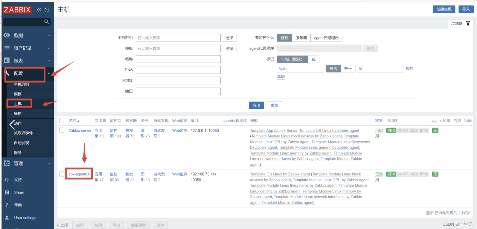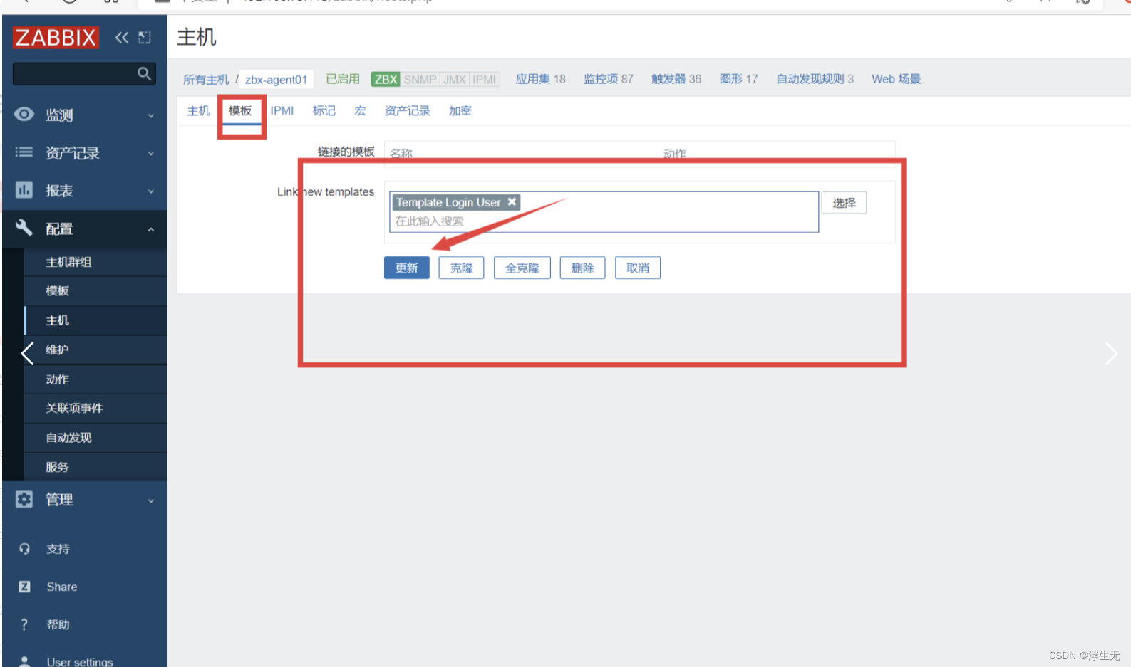 点击左边菜单栏【配置】中的【主机】,点击你要关联的主机
