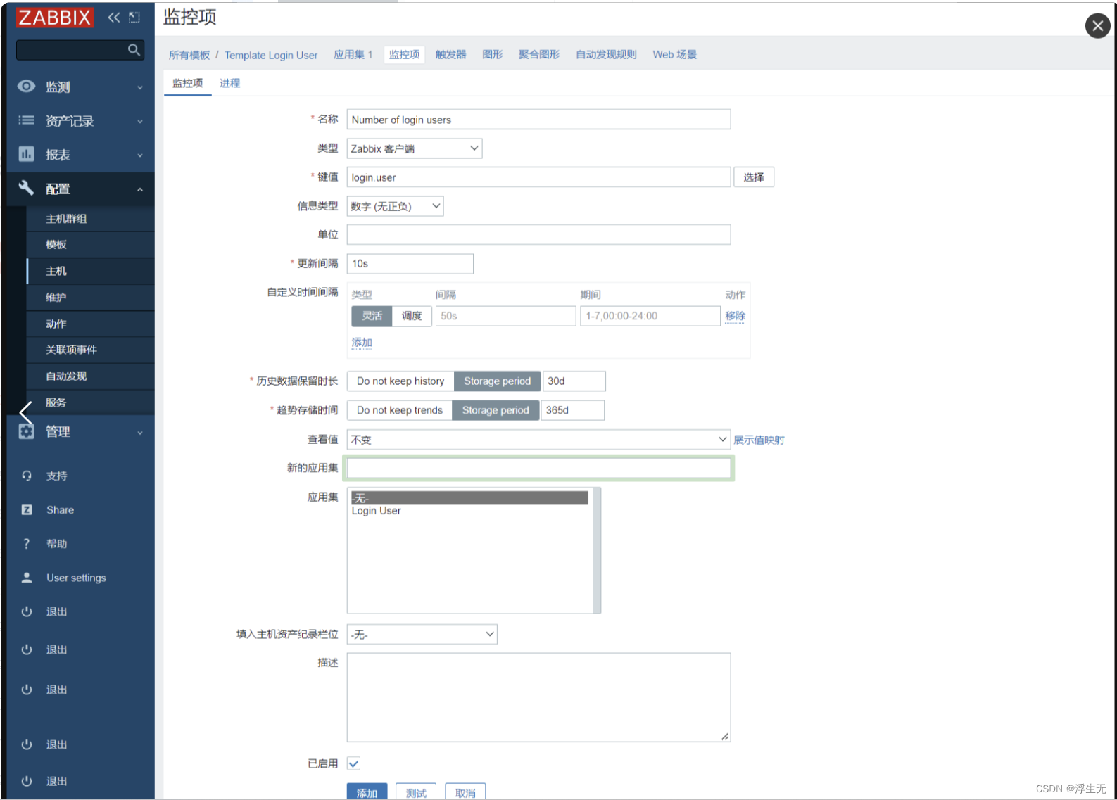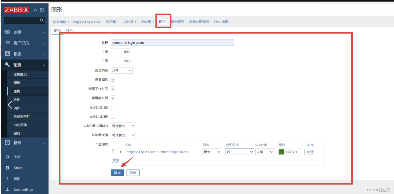 【监控项】点击添加勾选相关监控项 Number of login users,【功能】选择 最大,其它可保持默认值