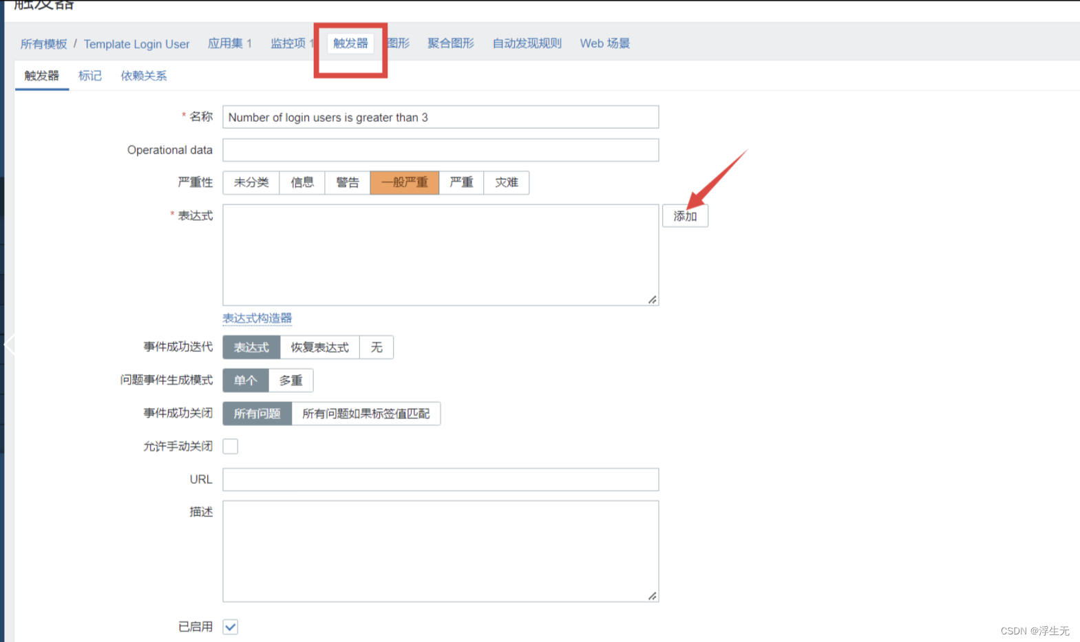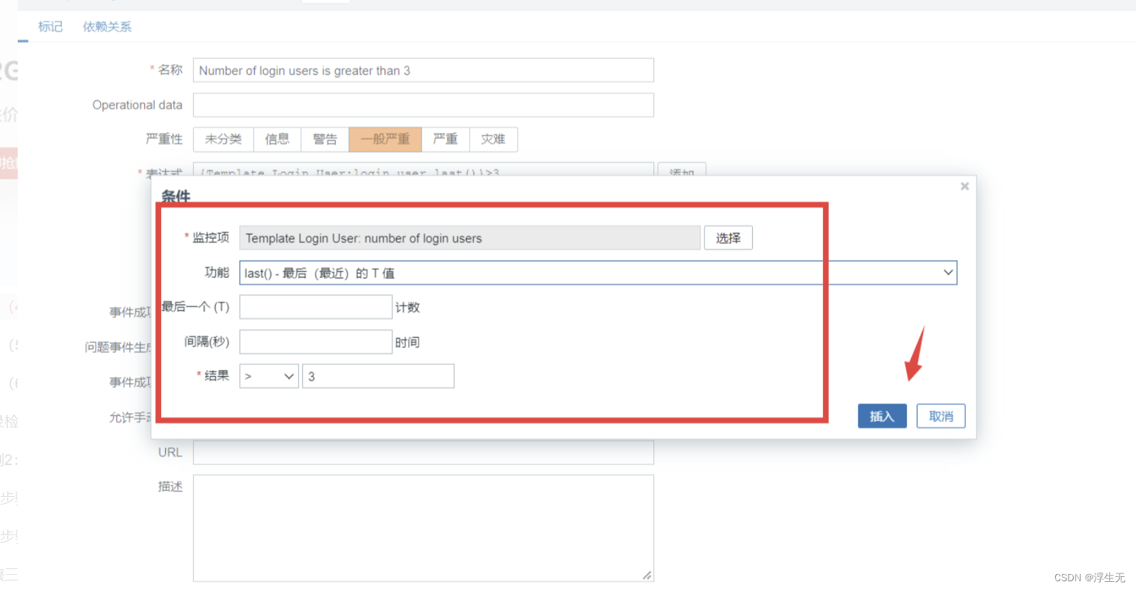 【表达式】点击添加,【监控项】点击选择 Number of login users,【功能】选择 last(),【结果】选择 > 3,点击 【插入】