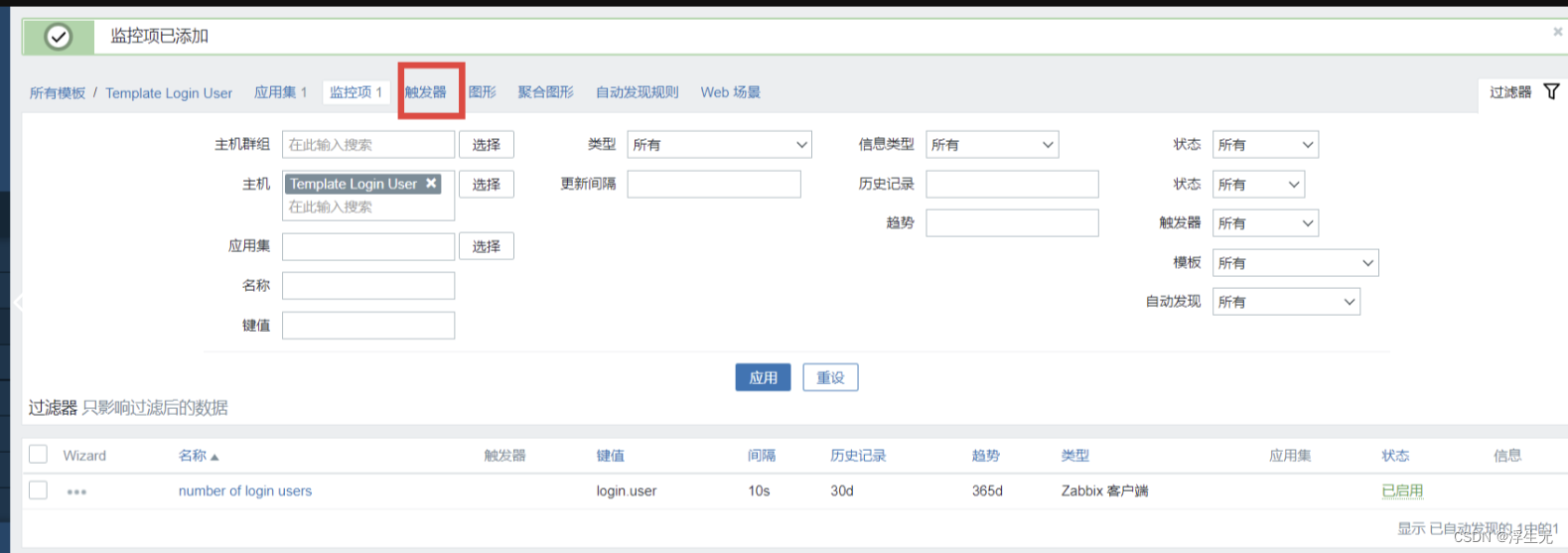 4)创建触发器(当监控项获取到监控的值后和触发器预设的值进行对比,判断是否报警)